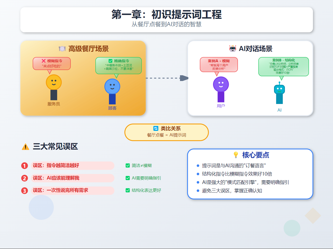 提示词(Prompt)就是我们与AI沟通的"订餐语言"。它是我们输入给AI大模型的指令、问题或上下文,决定了AI能否准确理解我们的意图并给出期望的回应。
