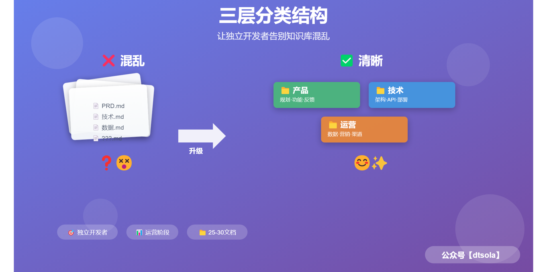 我是 dtsola【IT解决方案架构师 | 一人公司实践者】,之前分享了《一人公司的产品研发方法论:从想法到上线的完整指南》,其中提到的知识库管理问题引发了很多关注。于是我又写了《独立开发者的文档管理难题:从混乱到高效,我用11个文档搞定产品0-1阶段》,专门介绍产品0-1阶段的知识库管理方案。