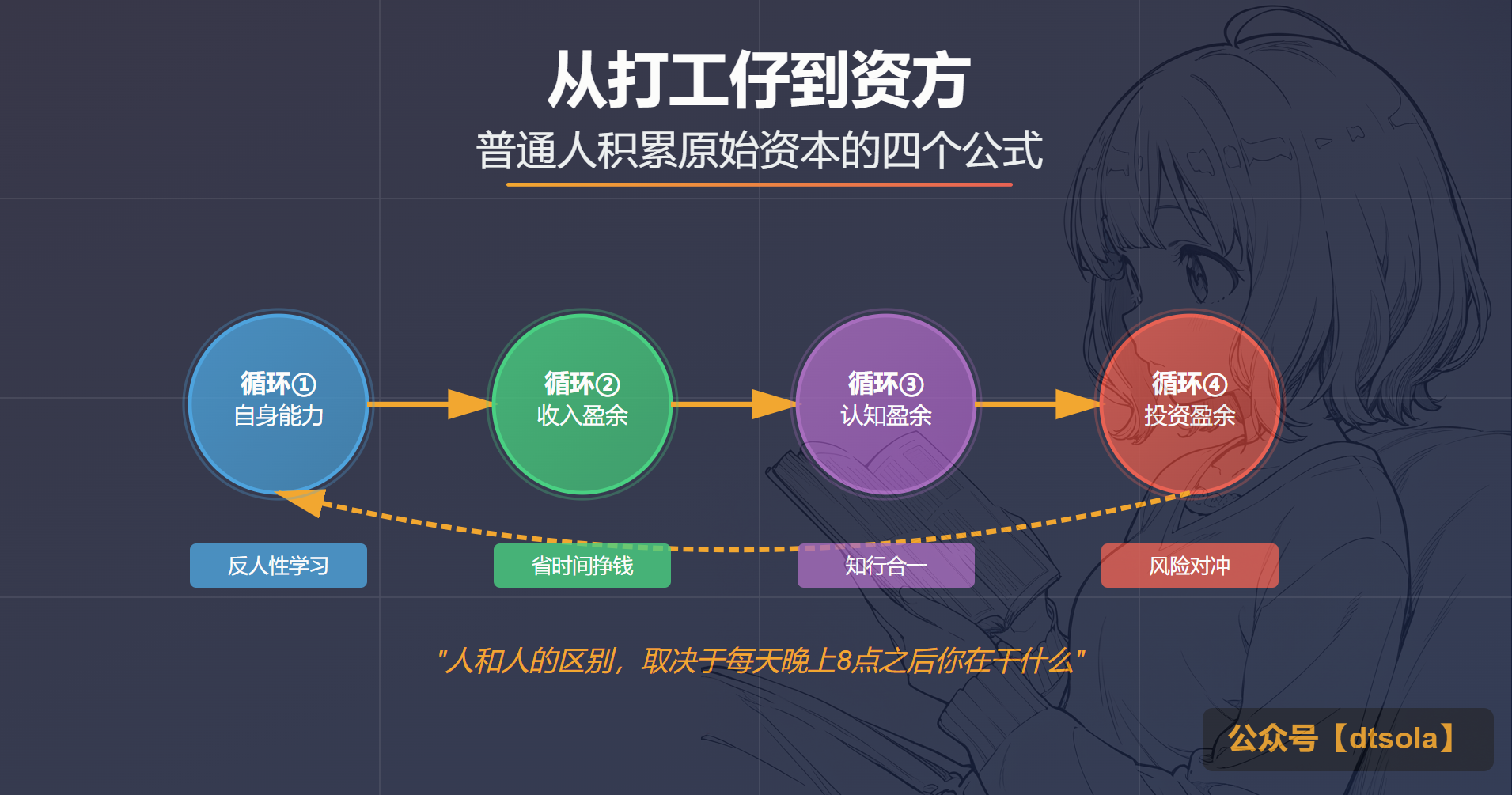 今天在B站刷到一个播放量30万+的视频《从打工仔到资方:普通人积累原始资本的四个公式》,看完之后我整个人都被点醒了——这不是那种"教你月入十万"的鸡汤,而是真正把财富积累的底层逻辑讲透了。