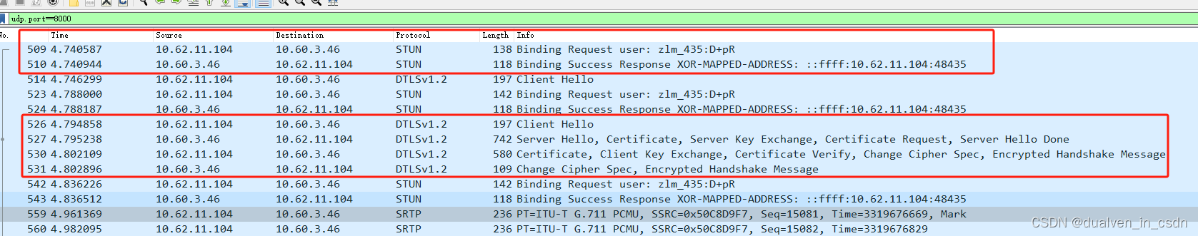 Web端首先根据协商的IP和端口,服务端webrtc的端口是8000,发送STUN命令再次获取STUN地址。
