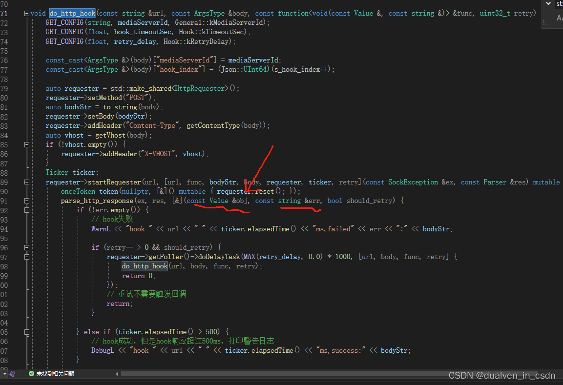 MediaServer.exe!do_http_hook::__l2::void <lambda>(const toolkit::SockException &, const mediakit::Parser &)::__l2::<lambda>(const Json::Value & obj, const std::string & err, bool should_retry) 行 213 C++