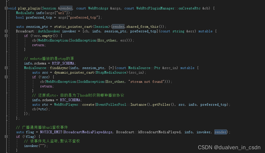 void play_plugin(Session &sender, const WebRtcArgs &args, const WebRtcPluginManager::onCreateRtc &cb)