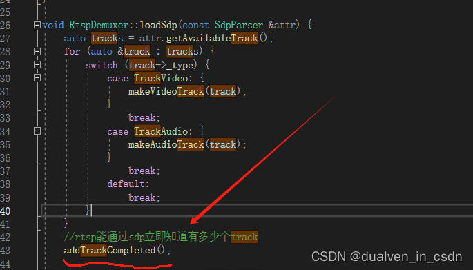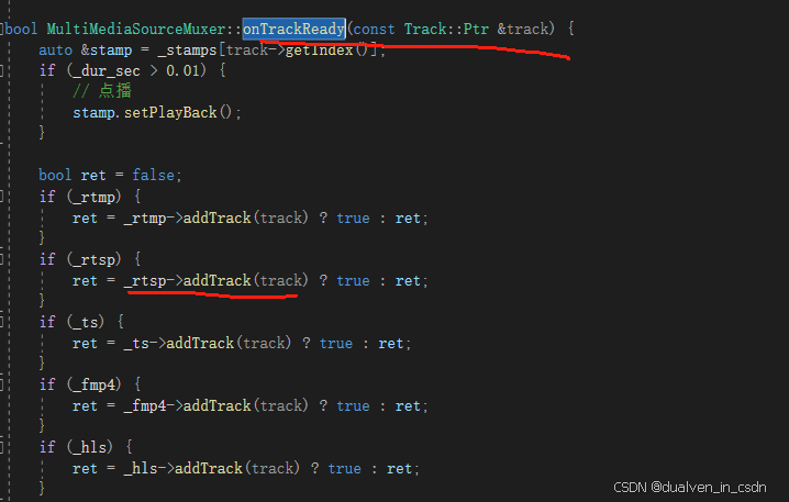demuxer -》makevideotrack ->Demuxer::addTrack->_listener->addTrack->RtspMediaSourceImp:addTrack()->_muxer->addtrack -> MultiMediaSourceMuxer->MediaSink::addTrack->_track_ready_callback[index] = [this, track]() { onTrackReady(track); };