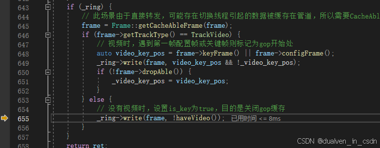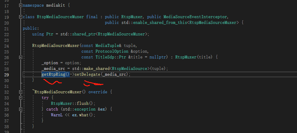 这里在 初始化的时候 ,RtspMediaSourceMuxer把 它的ring 委托给了 ms,这样就解释了,封装后,取的ms里的_ring,实际上取的就是 muxer里的ring 了!