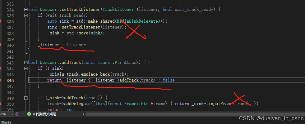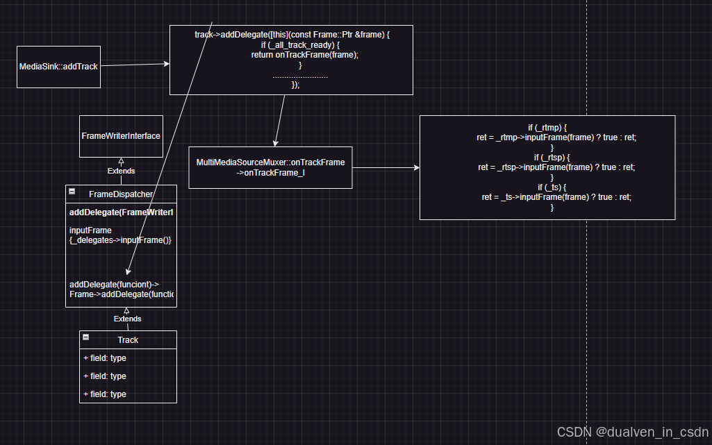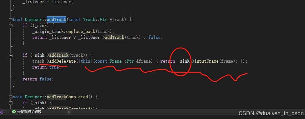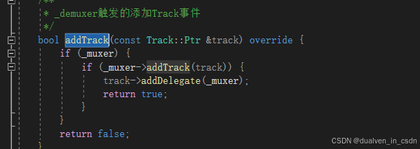 是因为,这个时候加 addtrack时,MultiMediaSourceMuxer :mediasink ,所以这块就直接使用的mediasink 的addtrack,而在 mediasink里给track加 delegate的时候,也是在这个mediasink:addtrack, 其实,这个时候,要把MultiMediaSourceMuxer 看成一个mediasink