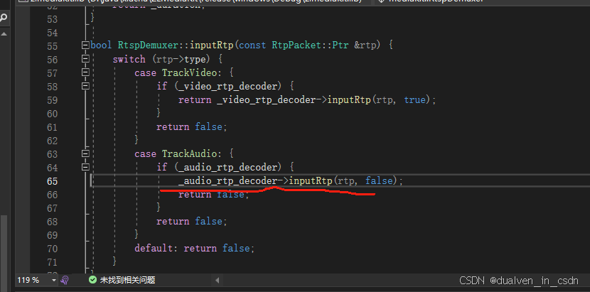 > MediaServer.exe!mediakit::RtspDemuxer::inputRtp(const std::shared_ptr<mediakit::RtpPacket> & rtp) 行 65 C++
