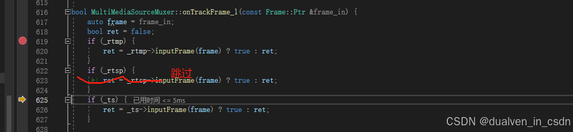 MediaServer.exe!mediakit::MultiMediaSourceMuxer::onTrackFrame(const std::shared_ptr<mediakit::Frame> & frame_in) 行 613 C++