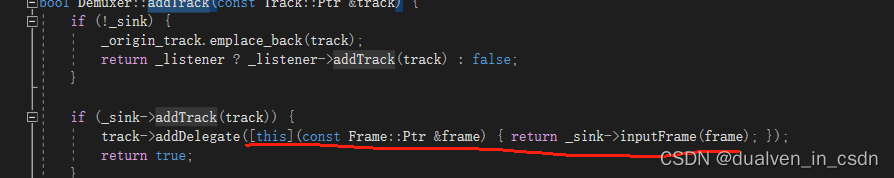 而 addTrack 将 track又加到了sink (muxer)里,作为它的track,且给这个track加一个代理 ,即会让muxer里对track里的frame进行了inputFrame(frame)的动作。 即track作为了一个承载frame的中价,让muxer有机会作inputFrame这个动作。