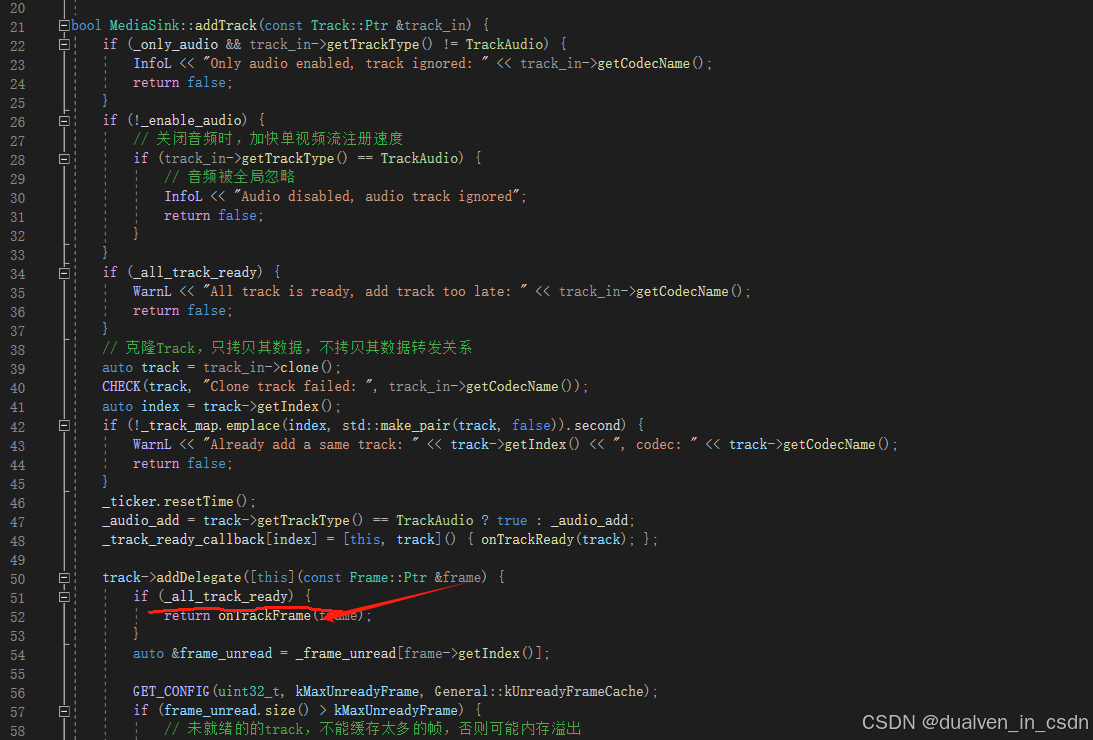 MediaServer.exe!mediakit::MediaSink::addTrack::__l2::<lambda>(const std::shared_ptr<mediakit::Frame> & frame) 行 52 C++