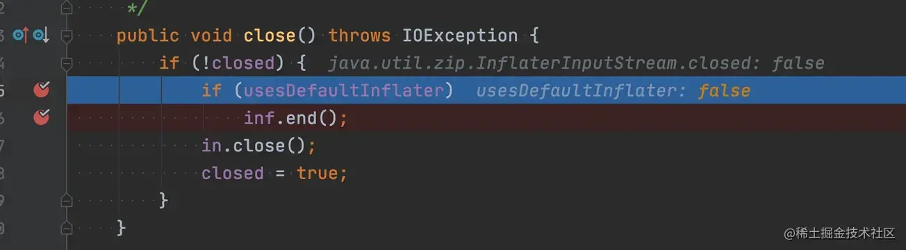 我本以为是 end 方法没有调用导致的,这种的确是有可能的,java.util.zip.InflaterInputStream 类的 close 方法在一些场景下是不会调用 Inflater.end 方法,如下所示。