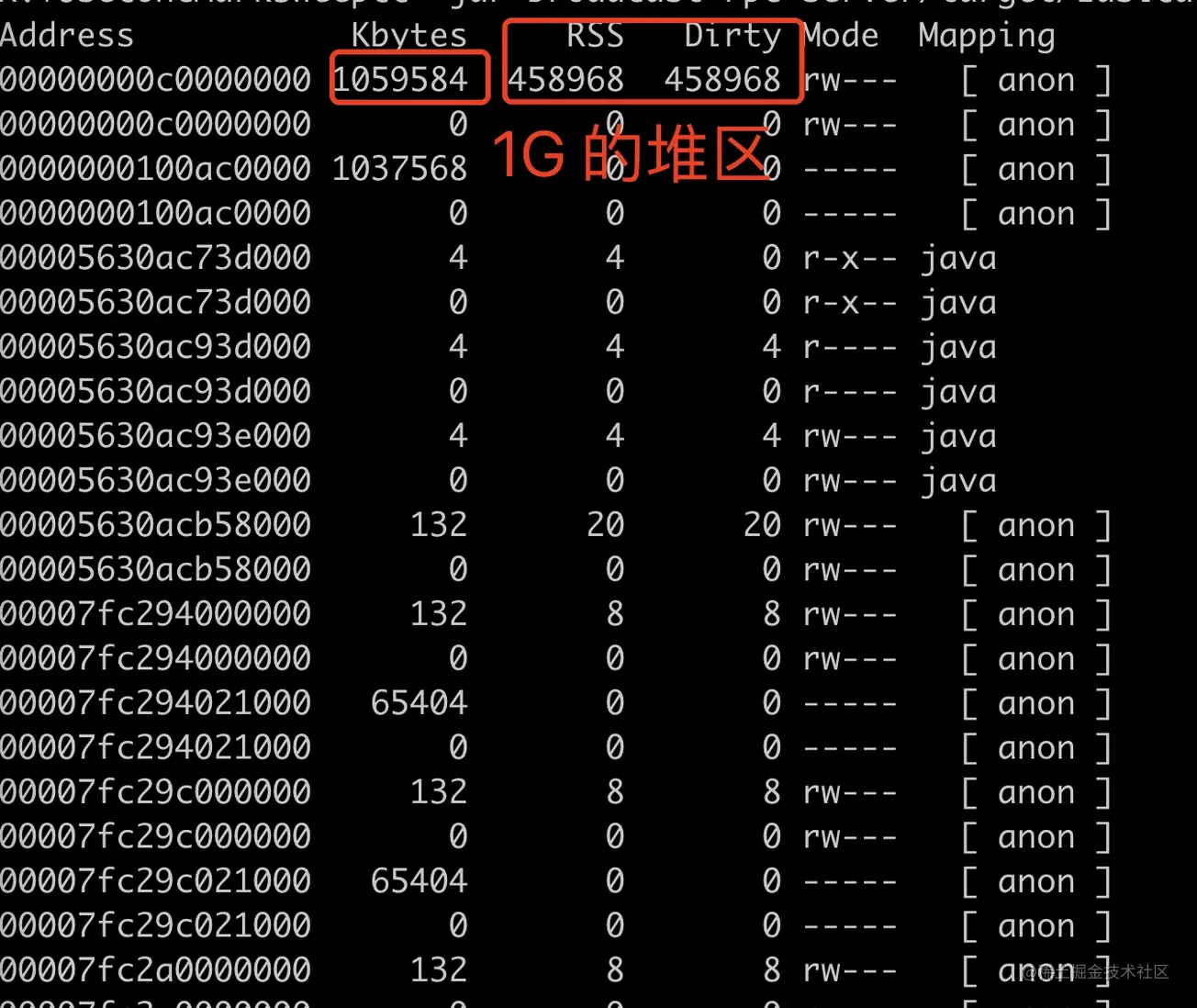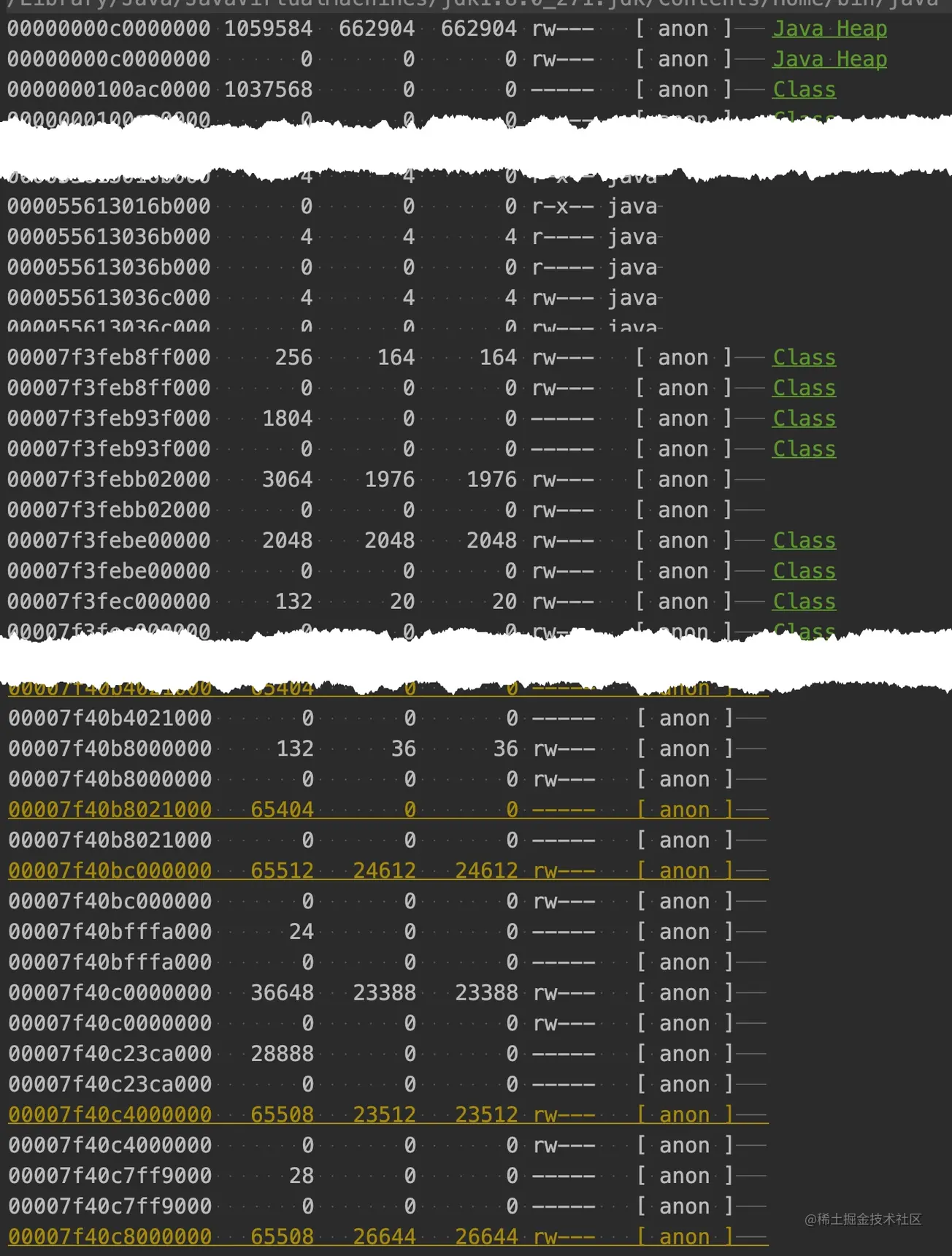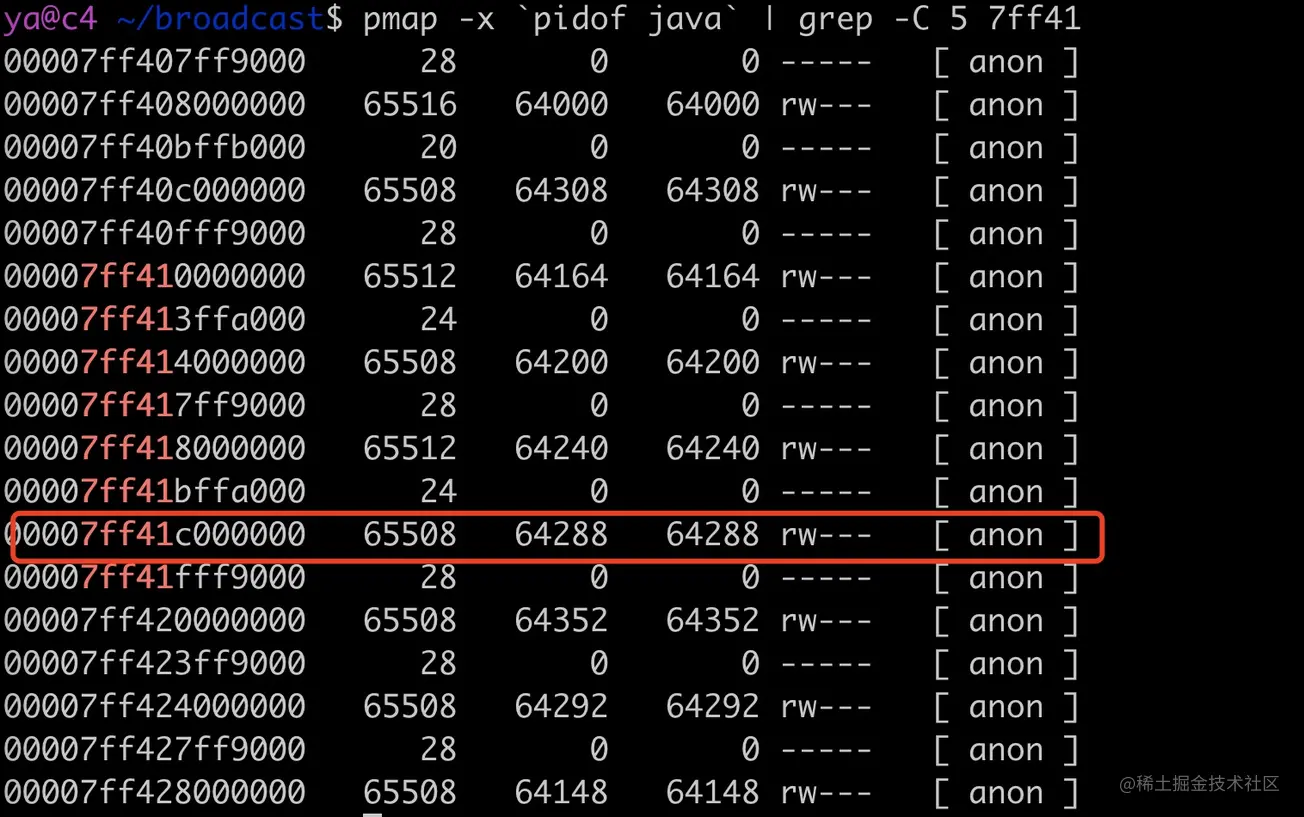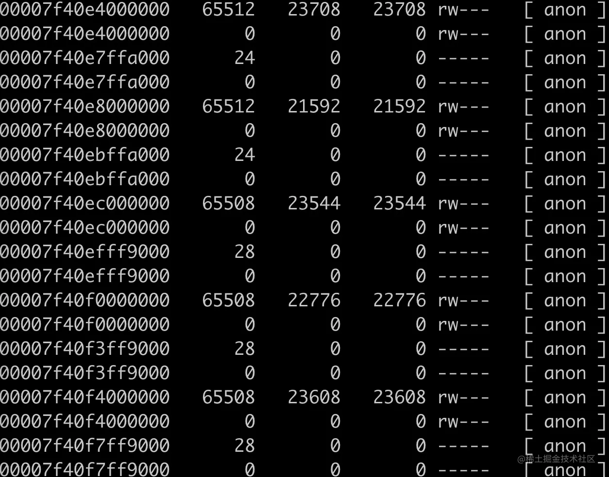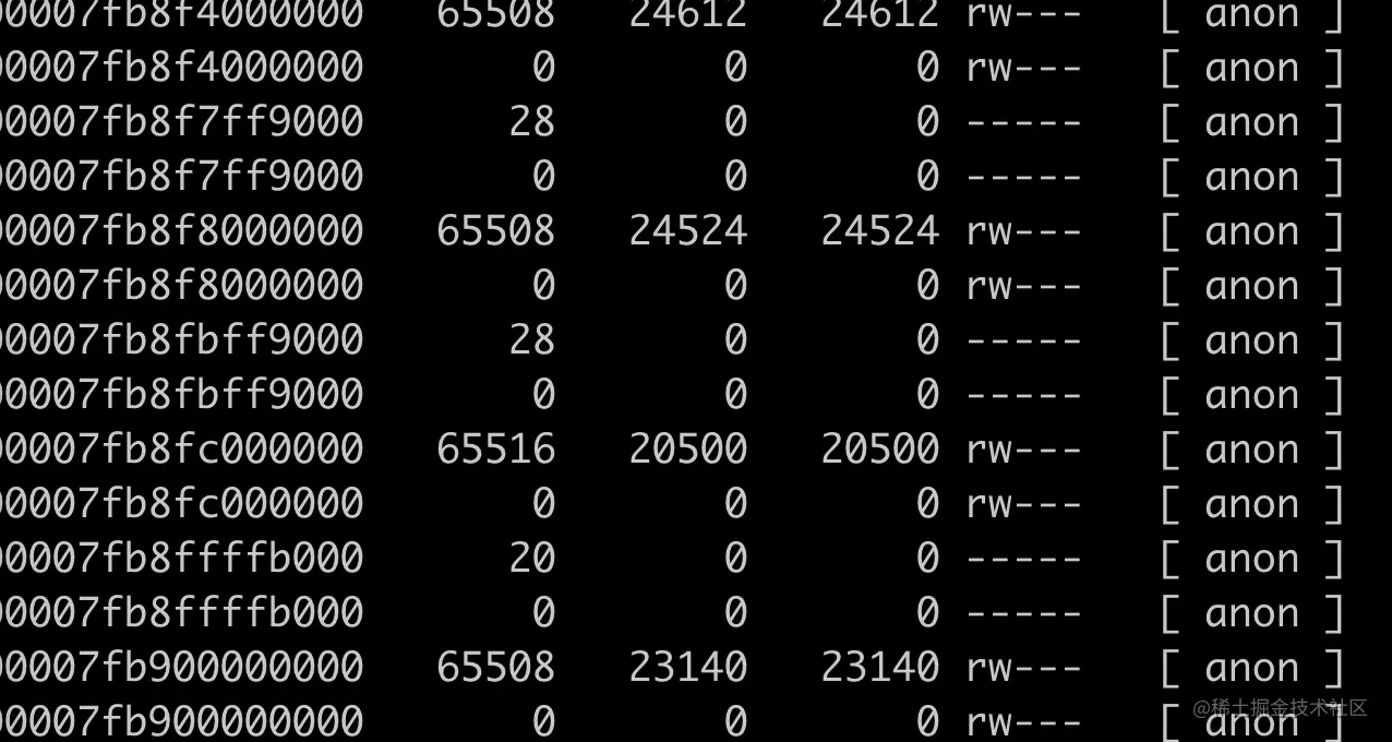 通过 pmap 我们可以查看进程的内存分布,可以看到有大量的 64M 内存区块区域,这部分是 linux 内存 ptmalloc 的典型现象,这个问题在之前的一篇「一次 Java 进程 OOM 的排查分析(glibc 篇)」已经介绍过了,详见:juejin.cn/post/685457…