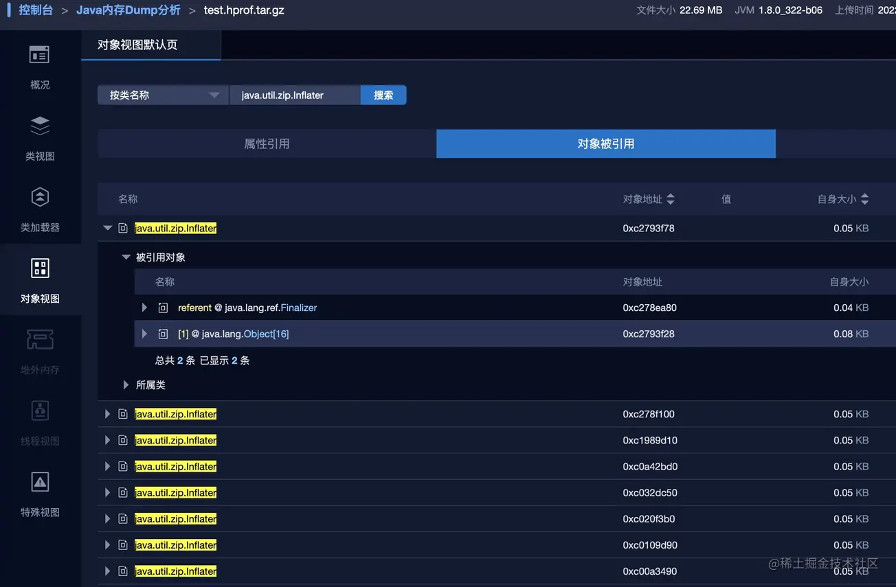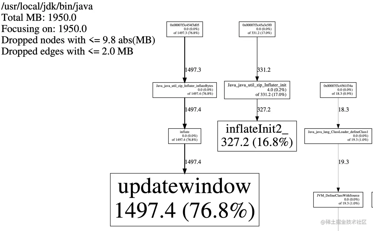可以看到绝大部分的内存申请都耗在了 Java_java_util_zip_Inflater_inflateBytes,jar 包本质就是一个 zip 包, 在读取 jar 包文件过程中大量使用了 jni 中的 cpp 代码来处理,这里面大量申请释放了内存。