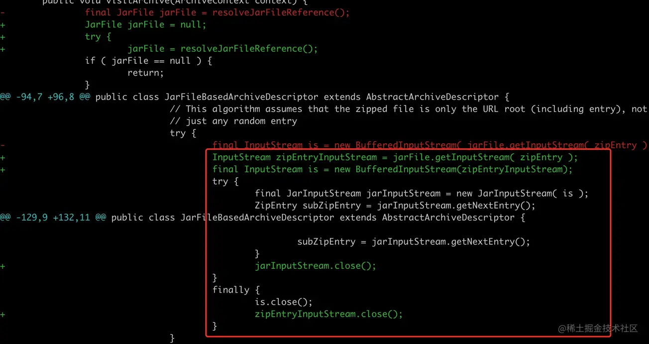 垃圾代码,jarFile.getInputStream( zipEntry ) 生成了一个新的流但没有做关闭处理。