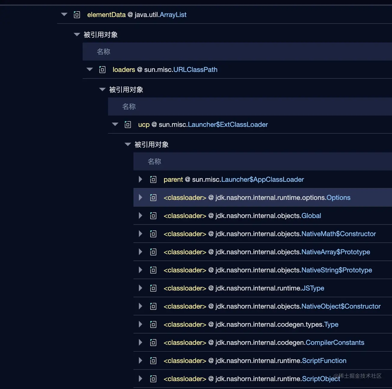 那到底是被谁引用的呢?展开引用链,看到出现了一堆 ClassLoader。