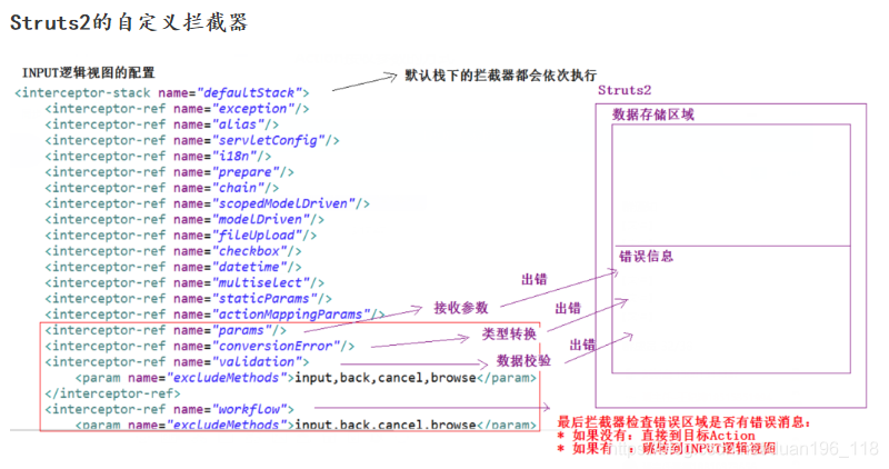 - 要想让默认的拦截器生效,就需要手动引入默认的拦截器(defaultStack)