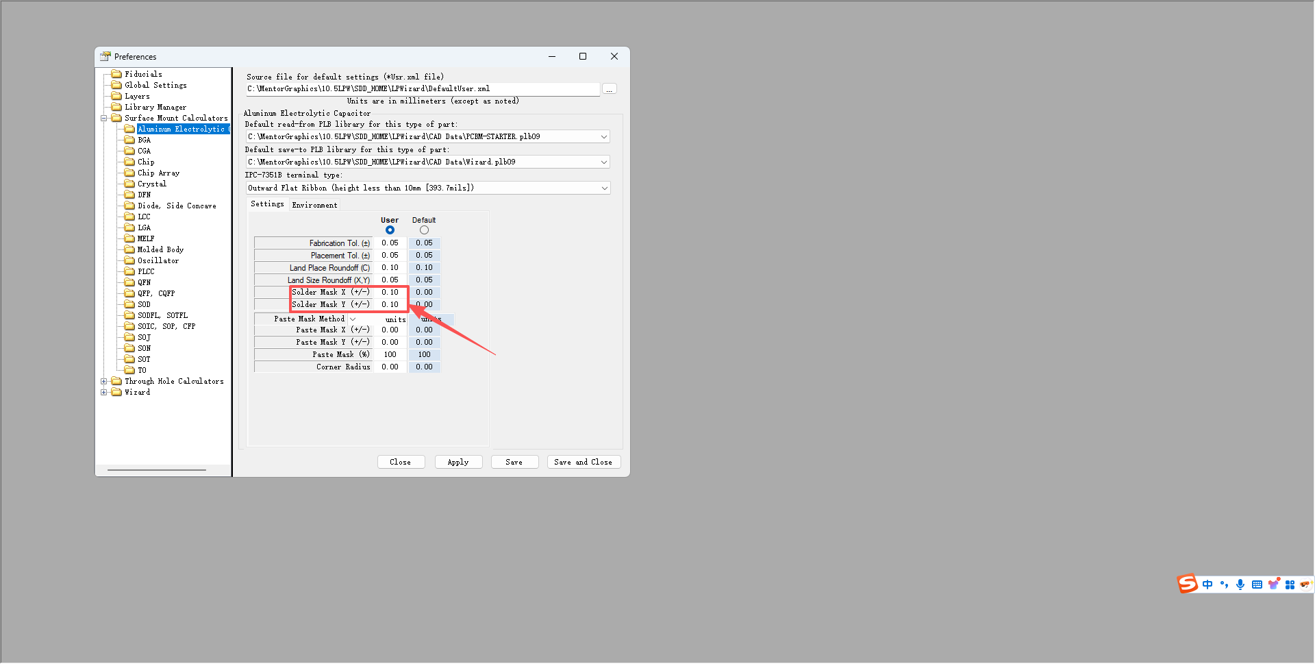 第二步:点击使用“User”,修改Solder Mask x和Solder Masker Y的误差值为“0.10”mm。