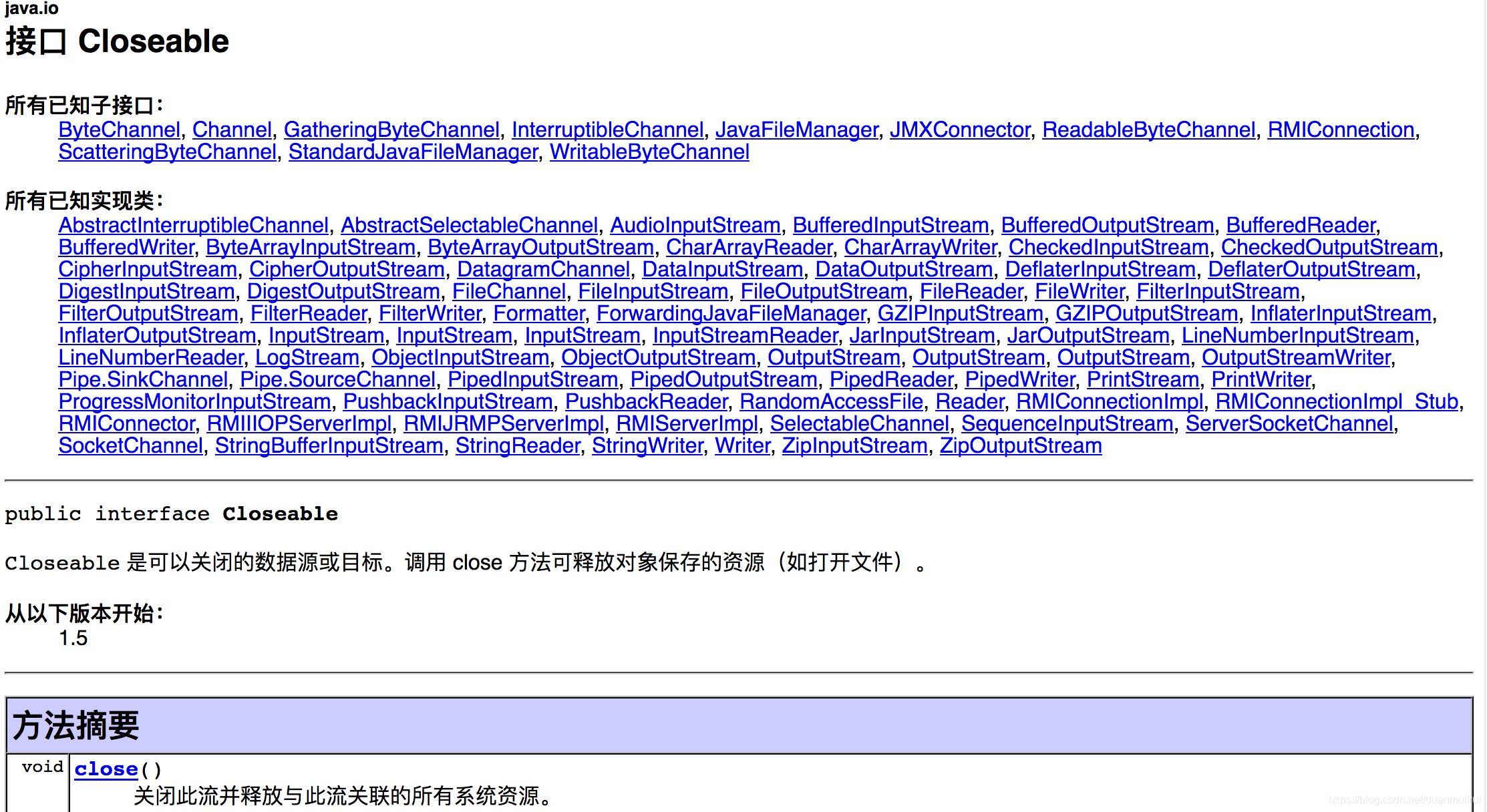 我们可能知道Java中有一个Closeable接口,该接口标识了一个可关闭的对象,它只有一个close方法,如下所示: