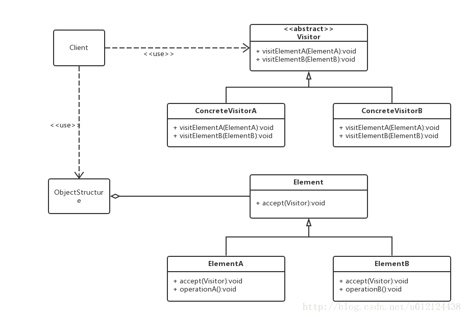 (1)Visitor:接口或者抽象类,它定义了对每一个元素(Element)访问的行为,它的参数就是可以访问的元素,它的方法数理论上来讲与元素个数是一样的,因此,访问者模式要求元素的类族要稳定,如果经常添加、移除元素类,必然会导致频繁地修改Visitor接口,如果这样则不适合使用访问者模式。