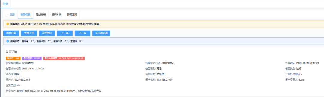 下面是态感平台检测到192.168.2.164系统上检测/test.sh脚本的产生的日志