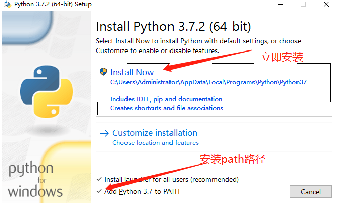 –下载地址https://www.python.org/ftp/python/3.7.2/python-3.7.2-amd64.exe
