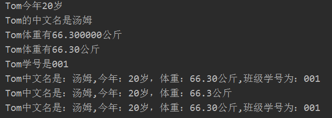 print(f"Tom中文名是:{name},今年:%s岁,体重:%.2f公斤,班级学号为:%03d" % (age, tizhong, TomNumber))