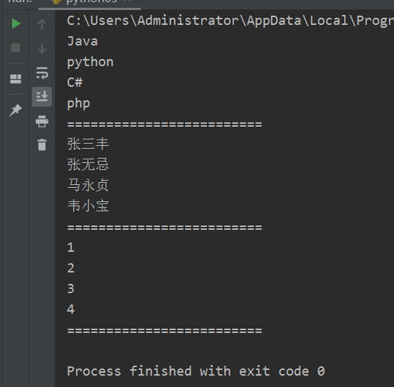 list1 = [["Java", "python", "C#", "php"], ["张三丰", "张无忌", "马永贞", "韦小宝"], [1, 2, 3, 4]]