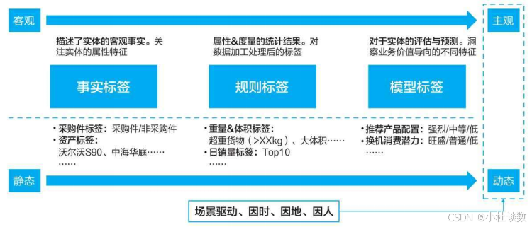 1)定义:标签是根据业务场景的需求,通过对目标对象(含静态、动态特性)运用抽象、归纳、推理等算法得到的高度精练的特征标识,用于差异化管理与决策。标签由标签和标签值组成,打在目标对象上。
