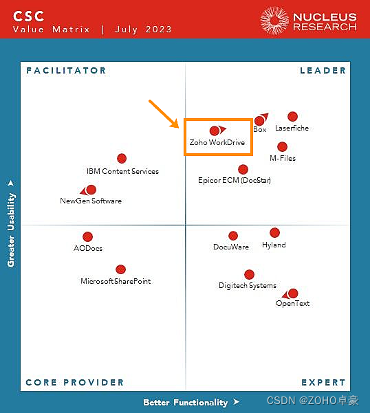 近日Nucleus Research发布的报告中,Zoho WorkDrive凭借强大的扩展&定制能力、高性价比和高安全性,入选技术价值矩阵“Leader”象限(内容服务与协作类)。