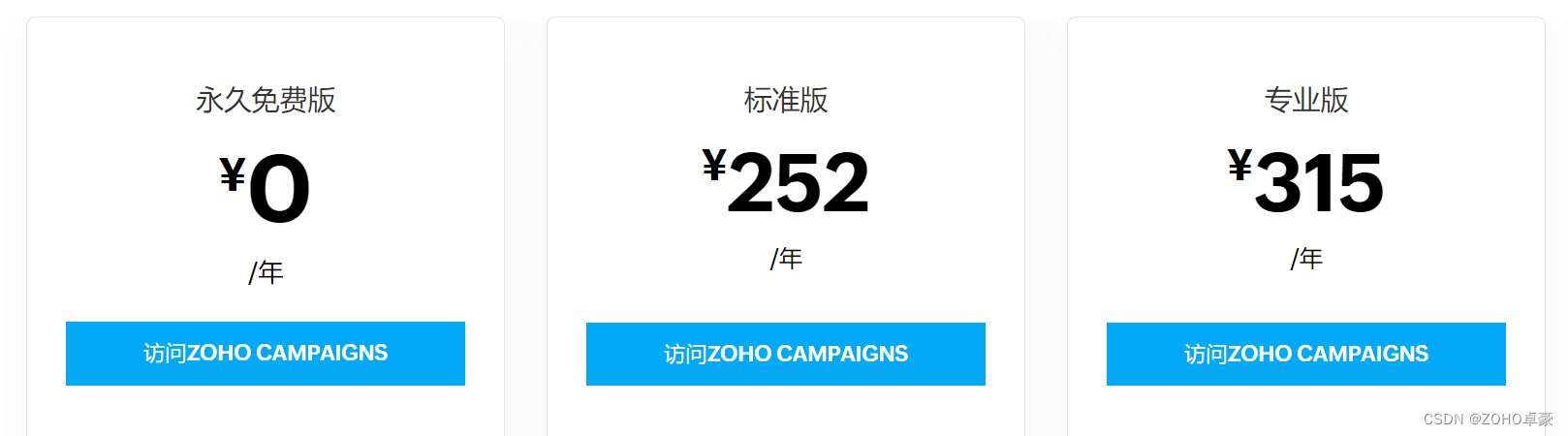 价格高低并不能决定产品功能的好坏。企业应该在预算内,选择一款最符合需求邮件群发软件。Zoho Campaigns提供免费版、标准版、专业版三个不同的版本,支持月份及年付。若是不确定想试用一段时间,您可以按月支付,之后我们会为您保留一段时间数据。同时若按年付费,我们将为您提供可观的折扣。(延伸阅读:一套邮件群发工具大概多少钱?)