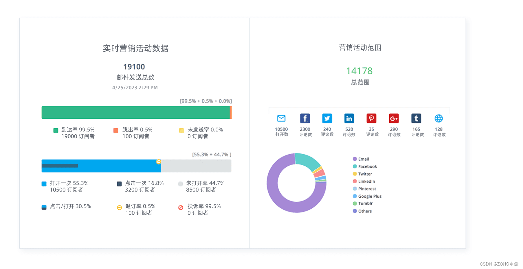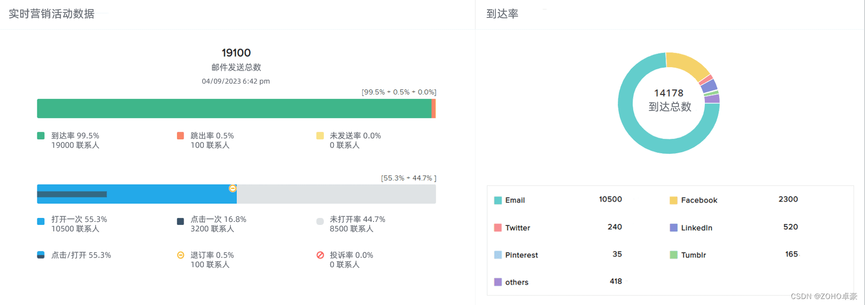 做外贸时通常需要借助工具,比如邮件营销工具Zoho Campaigns,它能帮助外贸人监测邮件到达率、打开率、跳出率、退订率等数据,便于大家进行效果分析。