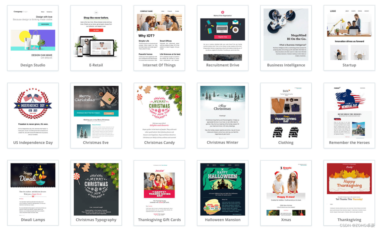 Zoho Campaigns提供了丰富的邮件模板库,适用于不同的使用场景,点击即可使用,省去了繁琐的设计步骤。同时,其拖拽式编辑器简化了邮件设计的难度,可任意自定义您的营销邮件。