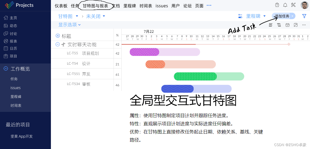 Zoho Projects项目管理工具核心功能包括WBS项目分解、团队协同(动态、聊天、论坛)、工时管理、项目报表(资源利用图、甘特图、计划/实际对比报表)、文档管理、项目日历、自定义角色/权限、任务流程自动化等等。