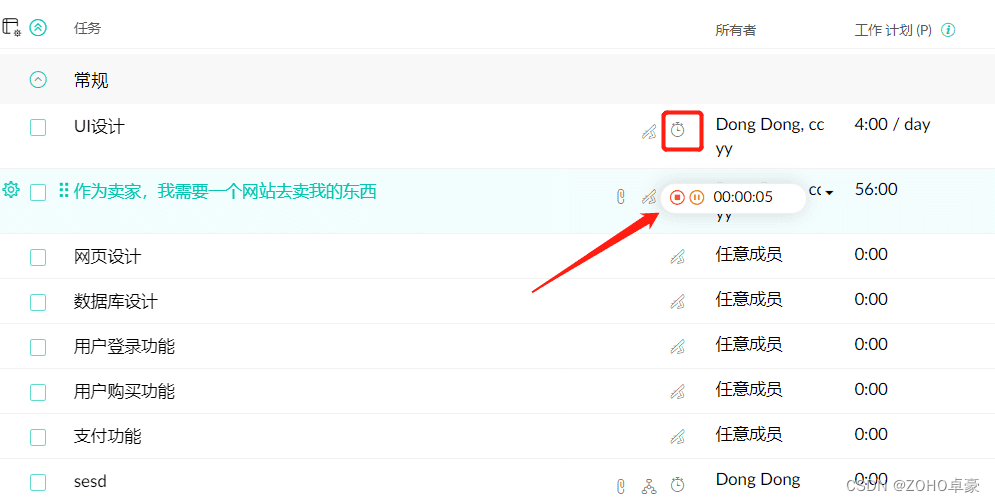 项目工时管理:Zoho Projects项目管理工具时间表模块中,可以按照日期或者用户切换视图,填写工时后可以关联到具体任务,添加就会生成一条工时记录。管理者可以通过日/周/月时间日志查看整体的工时情况。