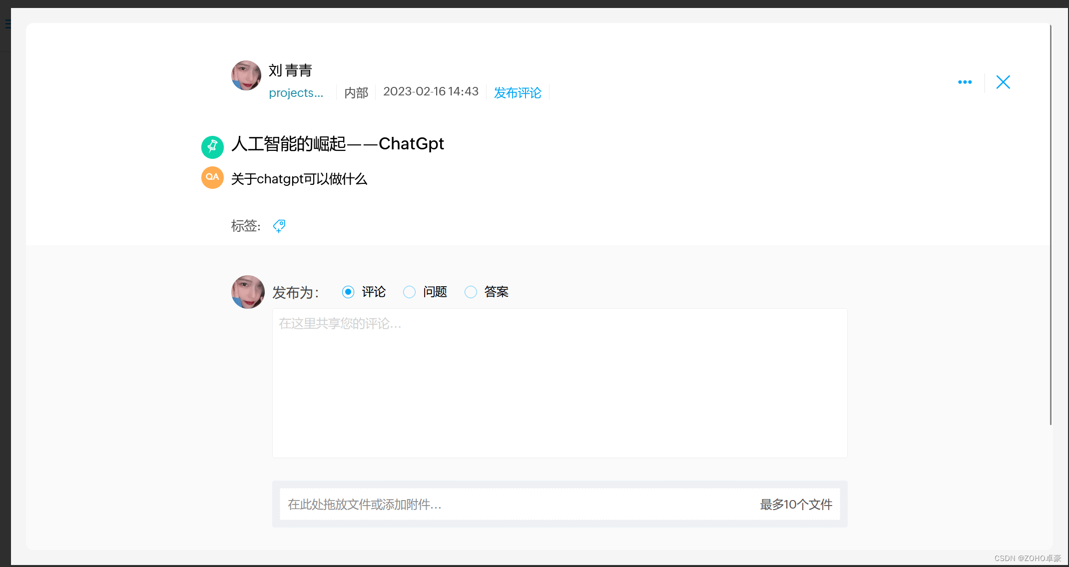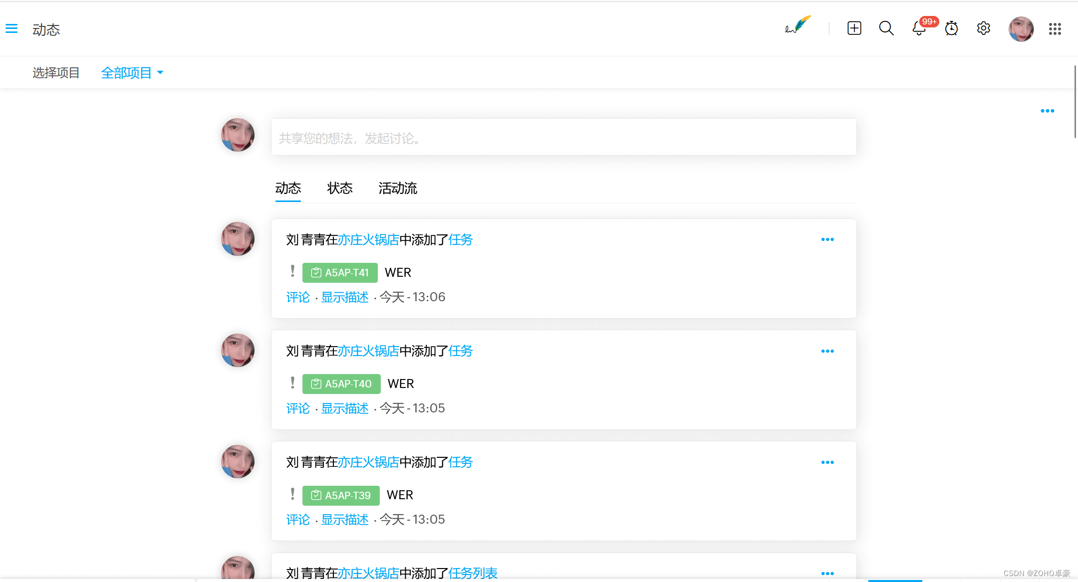 项目管理软件中的项目消息是有关整个门户中活动的通知,活动可以是与工作有关的任何事情,例如添加任务、更新文档、对状态发表评论等。发布形式很像“微博”团队成员发布一条动态,内部成员可以在帖子下方评论。