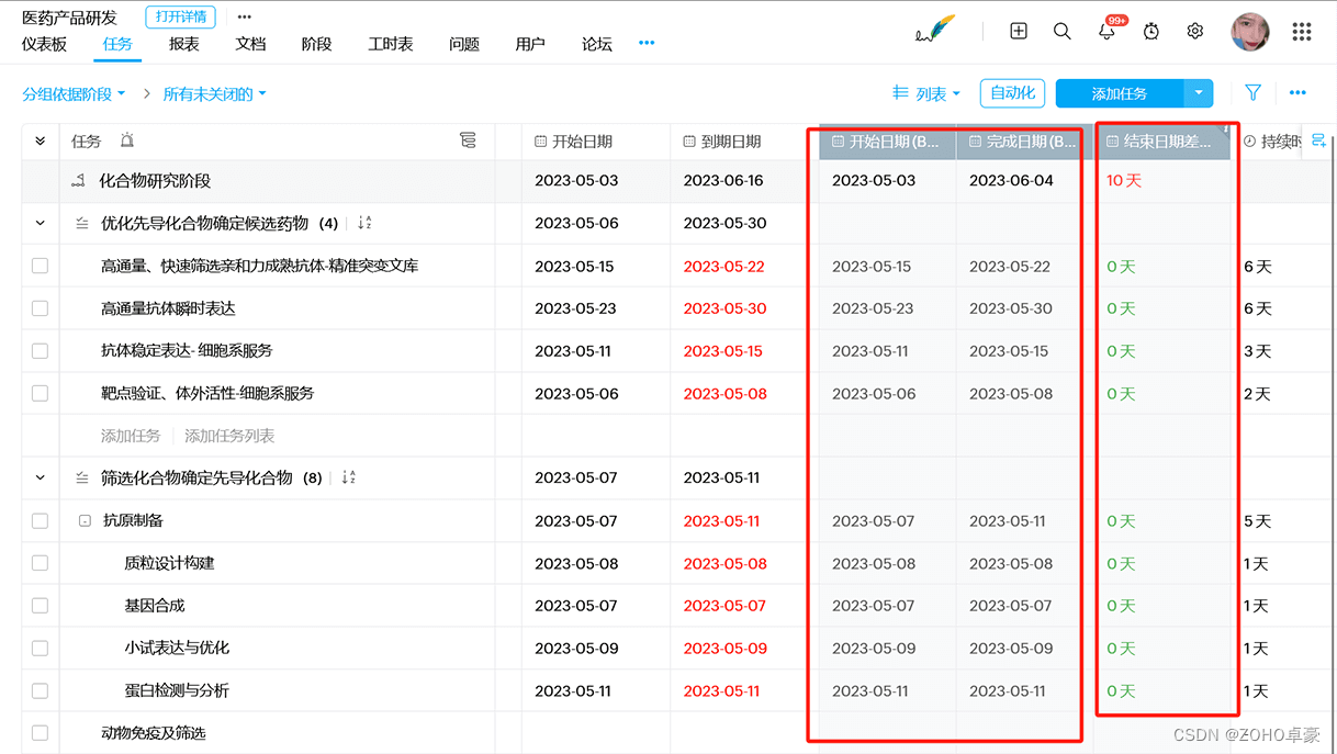 在Zoho Projects的甘特图中创建项目基线,在里程碑视图中就会生成一天灰色的线条,用于对比计划和实际的任务完成进度。同时在任务列表中用灰色列表表达任务的计划开始和结束日期,如果任务延期了,会有一个差值,在Zoho Projects中称之为结束日期差值。