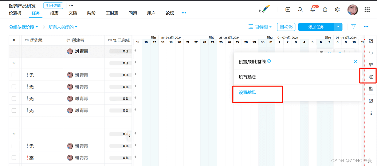 在Zoho Projects甘特图中,右侧栏点击基线表示,就可以创建一条新的基线。创建完基线之后,点击基线名称前的小圆就可以看到图中灰色的水平条,就是基线了。任务字段也有具体的基线的开始和完成日期以及与实际的对比。Zoho Projects项目管理工具最多支持创建6条基线。