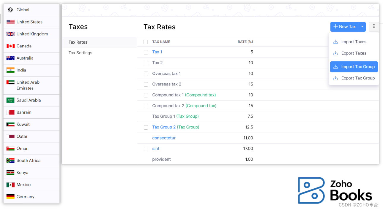 Zoho Books外贸财务系统增值税申报方案已得到英国税务海关、阿联酋(FTA)政府、沙特阿拉伯(ZATCA)等国际机构认可,支持处理不同国家和地区的税收制度,能够帮助外贸企业自动计算税项、生成税务报告。方便企业轻松应对国际税务合规性挑战,降低税务风险。