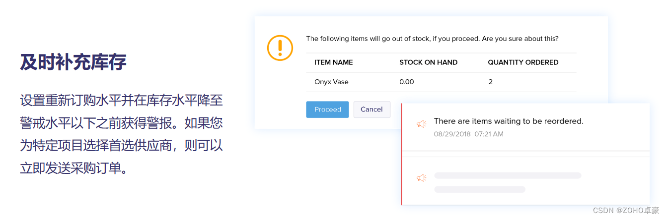 当库存低于预设的安全库存水平时,Zoho Books可以自动发送补货提醒,帮助企业管理库存,避免库存短缺或积压。