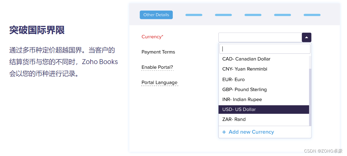 Zoho Books作为一个全球化视野下的外贸财务系统,专为出海企业打造了一系列量身定制的功能和特性,从而满足企业在跨地域经营过程中的复杂财务管理需求: