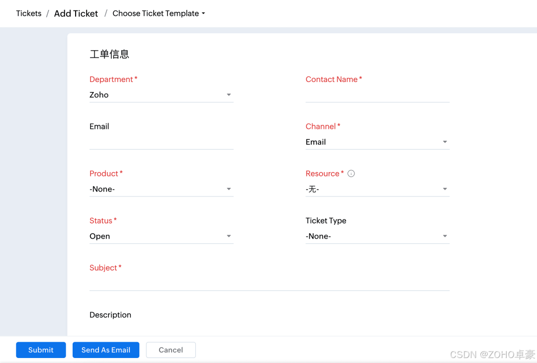 引入Zoho Desk之后,该企业实现了自助提交工单服务,客户在遇到问题时,可以在多种渠道反馈问题(直接发邮件、网站在线客服、社交媒体等等),系统会自动生成工单。当然,也可以由客服坐席针对客户的需求,手动创建一张客户工单。