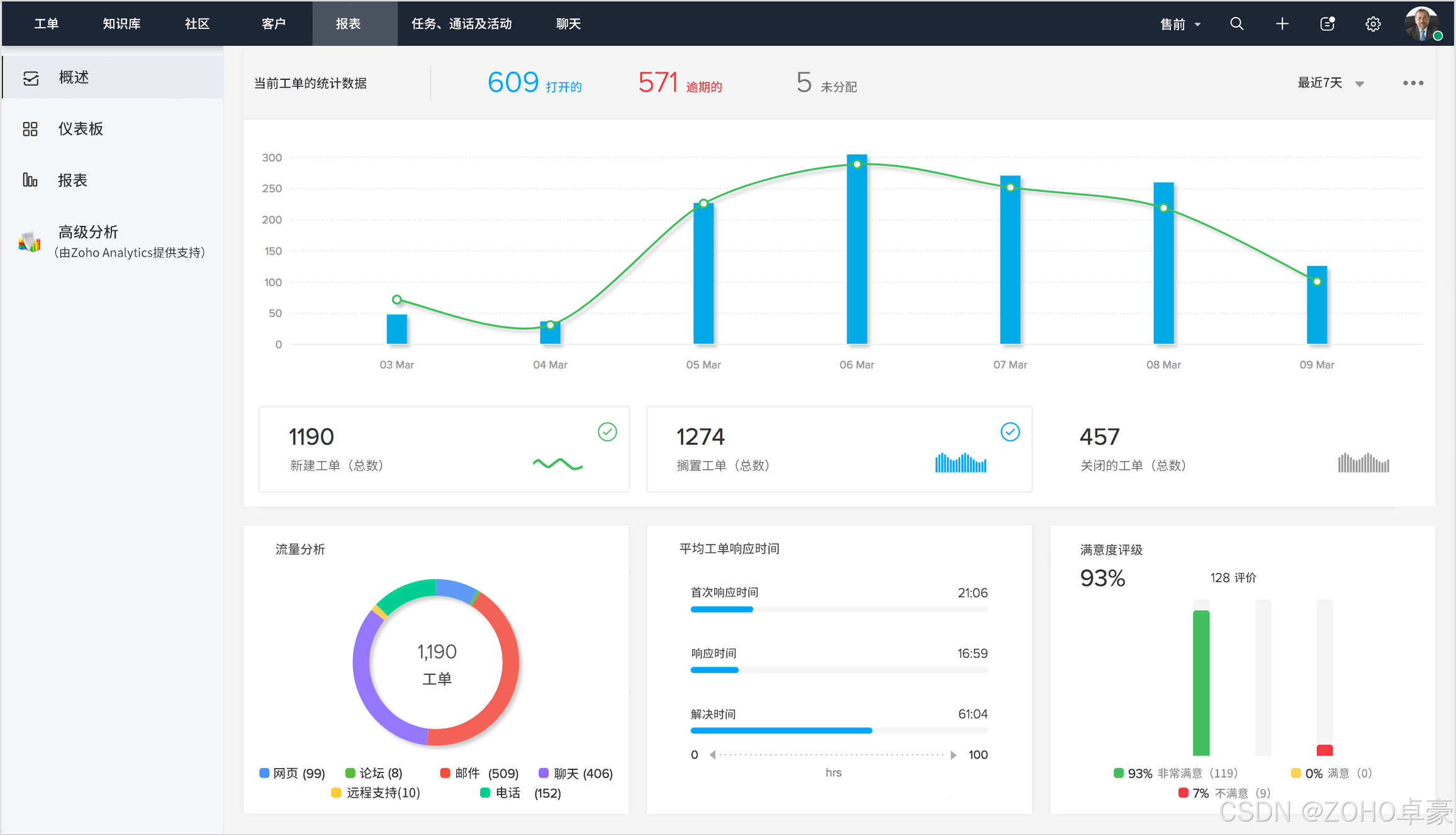 Zoho Desk 提供了详细的数据分析功能,可以生成各类服务指标的报告,如响应时间、解决时间、客服绩效等。数据化的管理使企业能够发现问题、改进服务流程,并做出明智的业务决策。