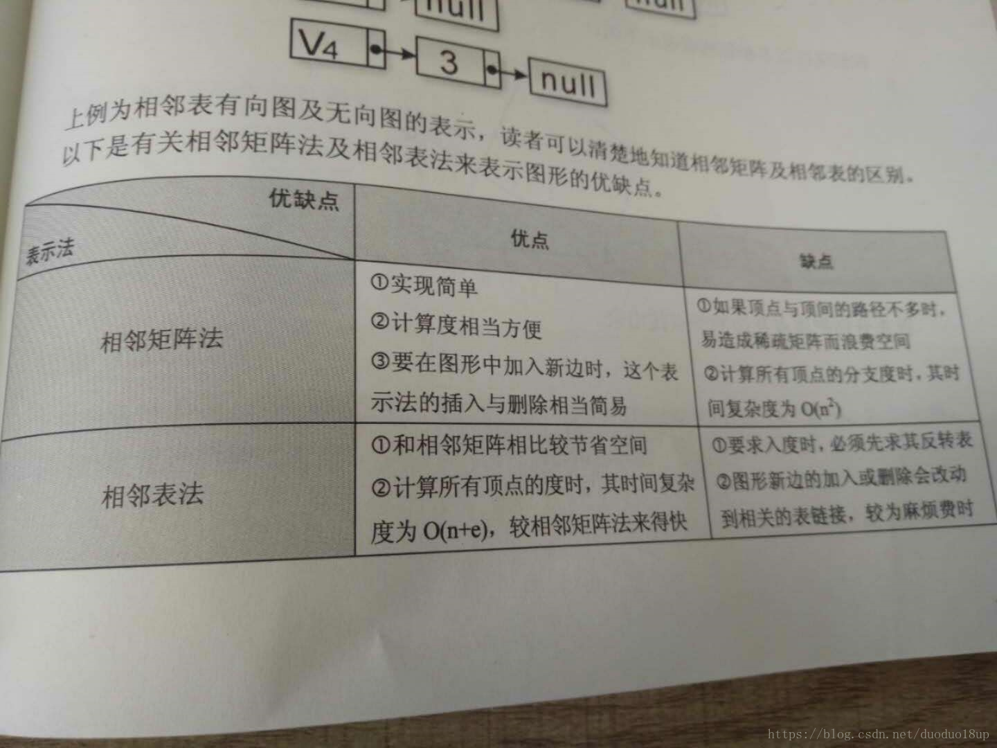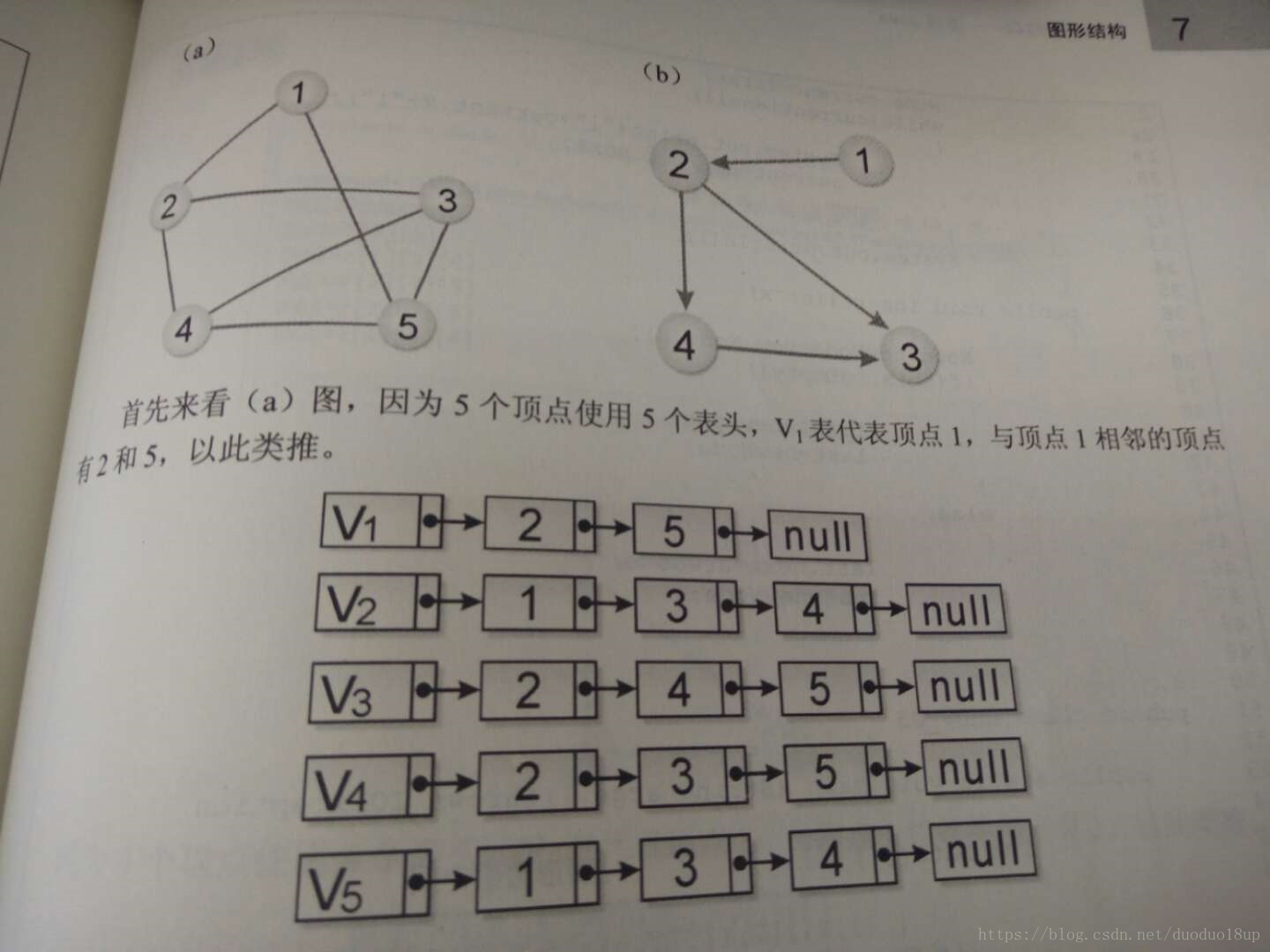 图形A有n个顶点,则用n个表(链表)来表示,每个顶点后面接着的表节点元素表示该顶点到该元素存在边,每个表的最后一个元素为null。