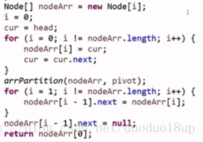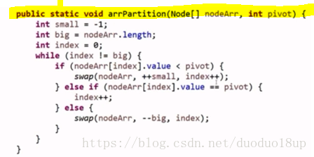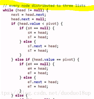 定义3个Node节点 ---- 名称为less more equal -----一次遍历之后分别获得第一个less more equal----之后继续遍历-----分别接在这三者的后面 ---- 统计每一个分链表的end指针-----最后将这三个分链表通过end连接------再连到一起