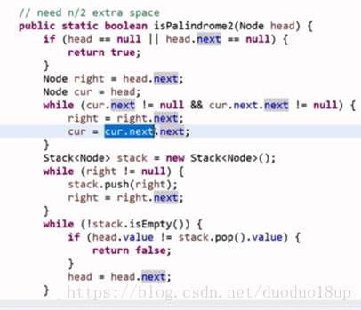 思路2: 先使用快慢指针找到链表中点位置-----然后将慢指针之后的元素压入栈中----最后弹栈-----