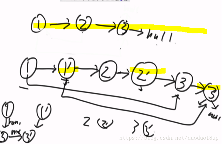 思路1 :使用“哈希表”的思想,存节点1 和1‘ 对应。。。。在遍历过程中对应重建一个新的链表