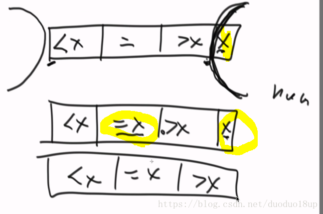 经典快排一次只能是搞定一个数 不管左边是否有X数 依然进行递归 而改进版的 只要是等于X的数无需再动