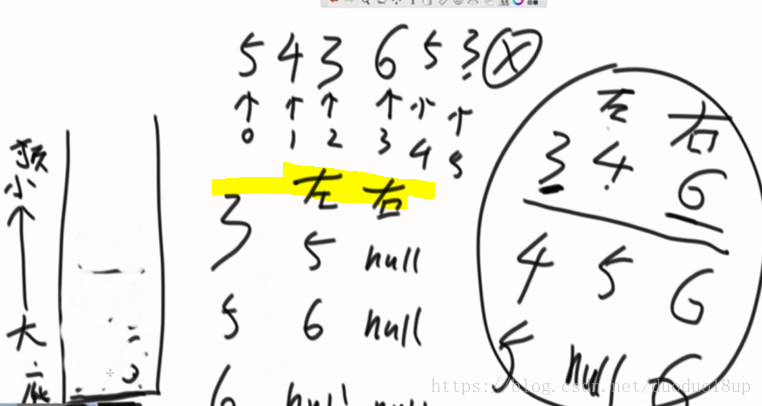 注意: 到数组末尾时 但是栈中依然有元素 则此时元素弹出 右为null 而左边为栈中的下一元素
