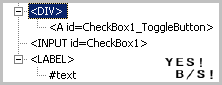 从DOM结构我们可以看出togglebutton最终的结构表现:在checkbox平级的前面放一个div(position是relative的),然后div里面有个a(position是absolute的),背景图片就是CheckedImageUrl或者UncheckedImageUrl,这样这个图片就把后面的checkbox的input(这时候它的Z-INDEX已经变成0,所以它在下面)挡住了。这样就只显示图片而没有框了。然后再通过脚本来关联图片的点击和checkbox的状态达到效果。知道了最终的结构表现我们就知道了,因为图片太大了,所以把后面的文字也挡住了。解决的办法就是设置后面文字(其实是放在label里面的)的margin-left就可以了。参考样式如下: