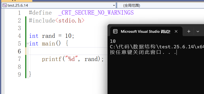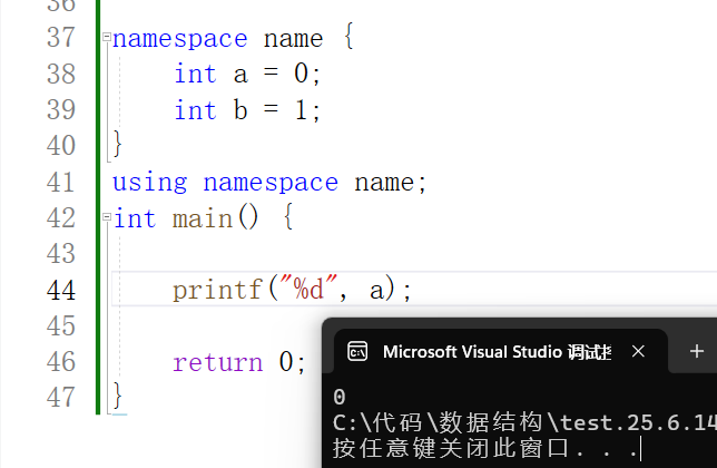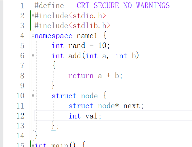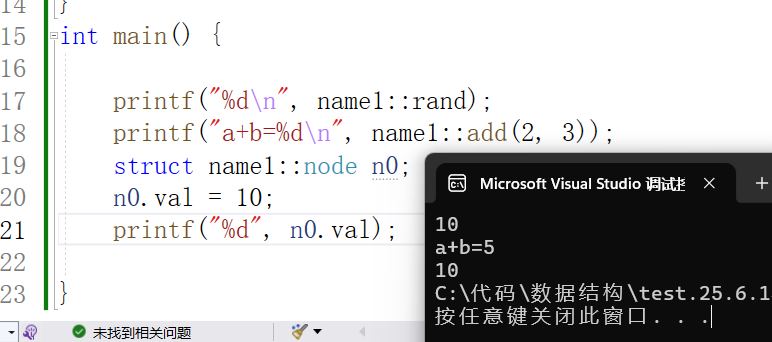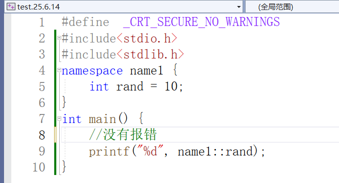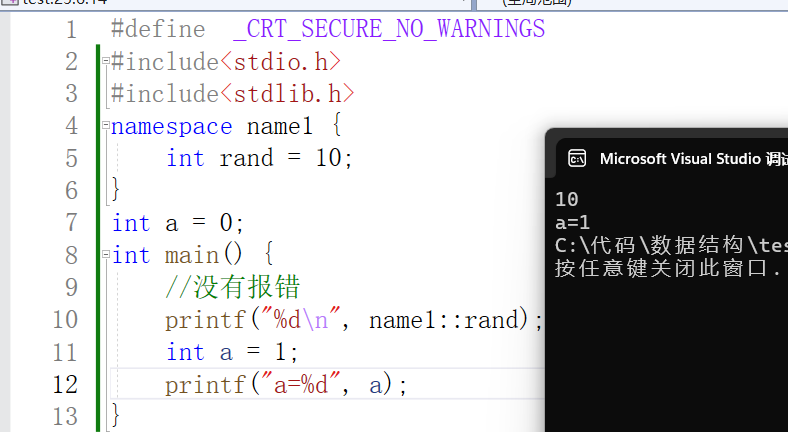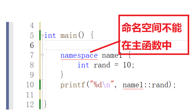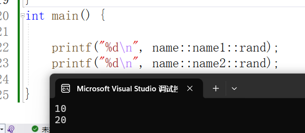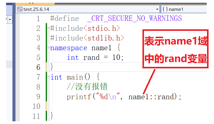 在本例中,name1为命名空间名称,rand为定义的变量。此时,name1与main函数位于不同的域。要想访问不用域中的变量等数据,需要用域操作符 :: 去访问,访问规则如:空间名称 :: 变量名称