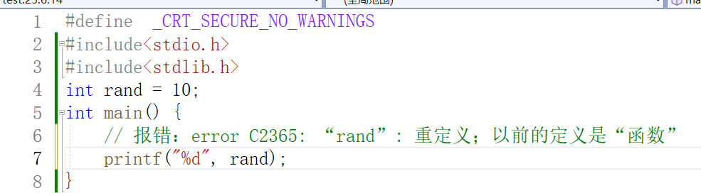 当我们包含了stdlib.h 这一头文件后发生了报错。这是由于发生了命名冲突,在头文件stdlib.h中包含这rand函数与int类型的rand变量发生了冲突,而导致报错。